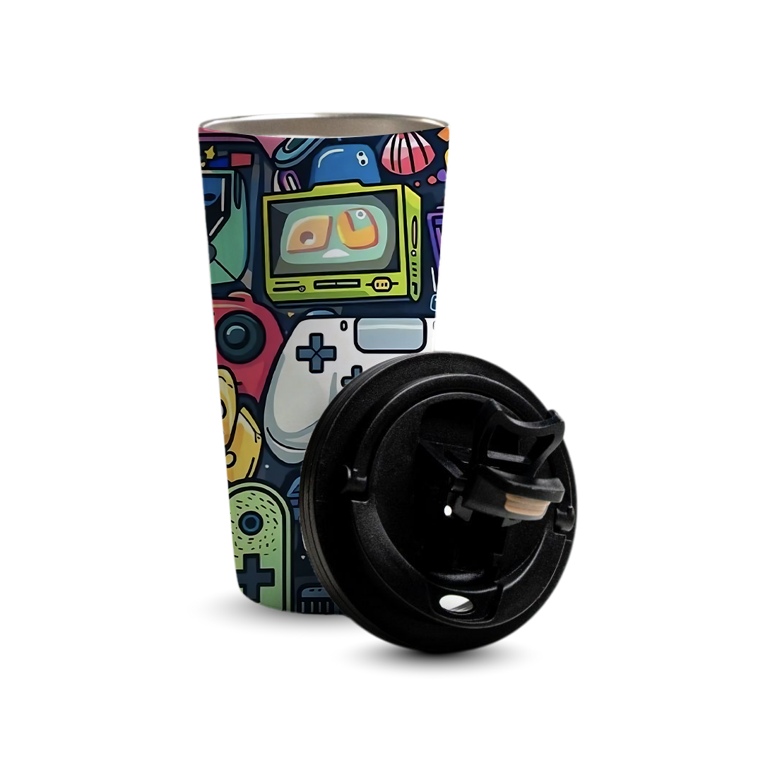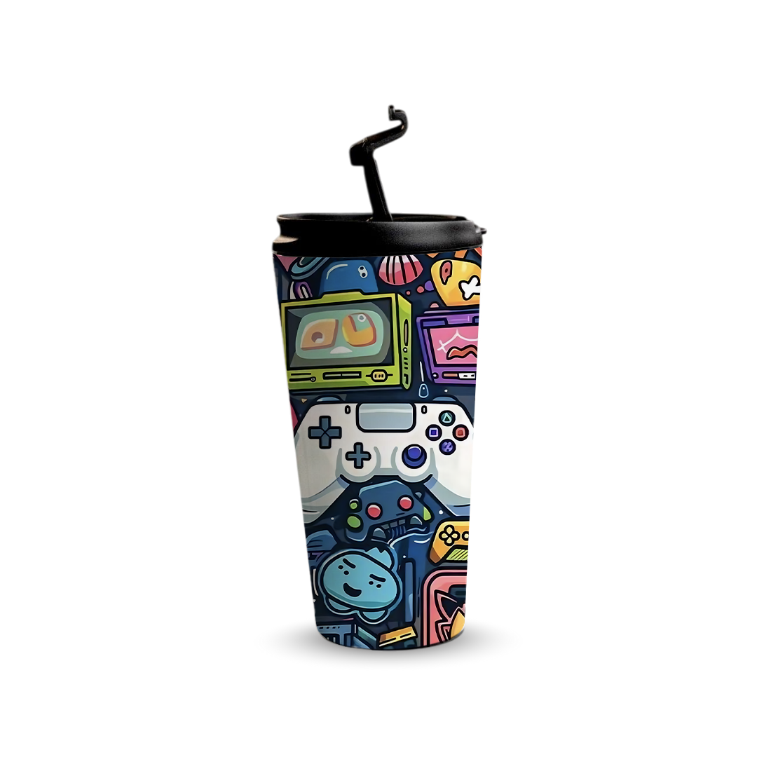 Sip in style with the Game Mode On 480ml Tumbler, crafted for convenience durability and everyday hydration. Designed with full wrap printing and a secure leak proof lid, this premium tumbler keeps your drinks at the perfect temperature throughout the day. Featuring a bold gaming inspired illustration packed with controllers retro screens playful icons and vibrant neon colors, it is perfect for personal use gifting corporate events or branding while adding both personality and performance to every sip.