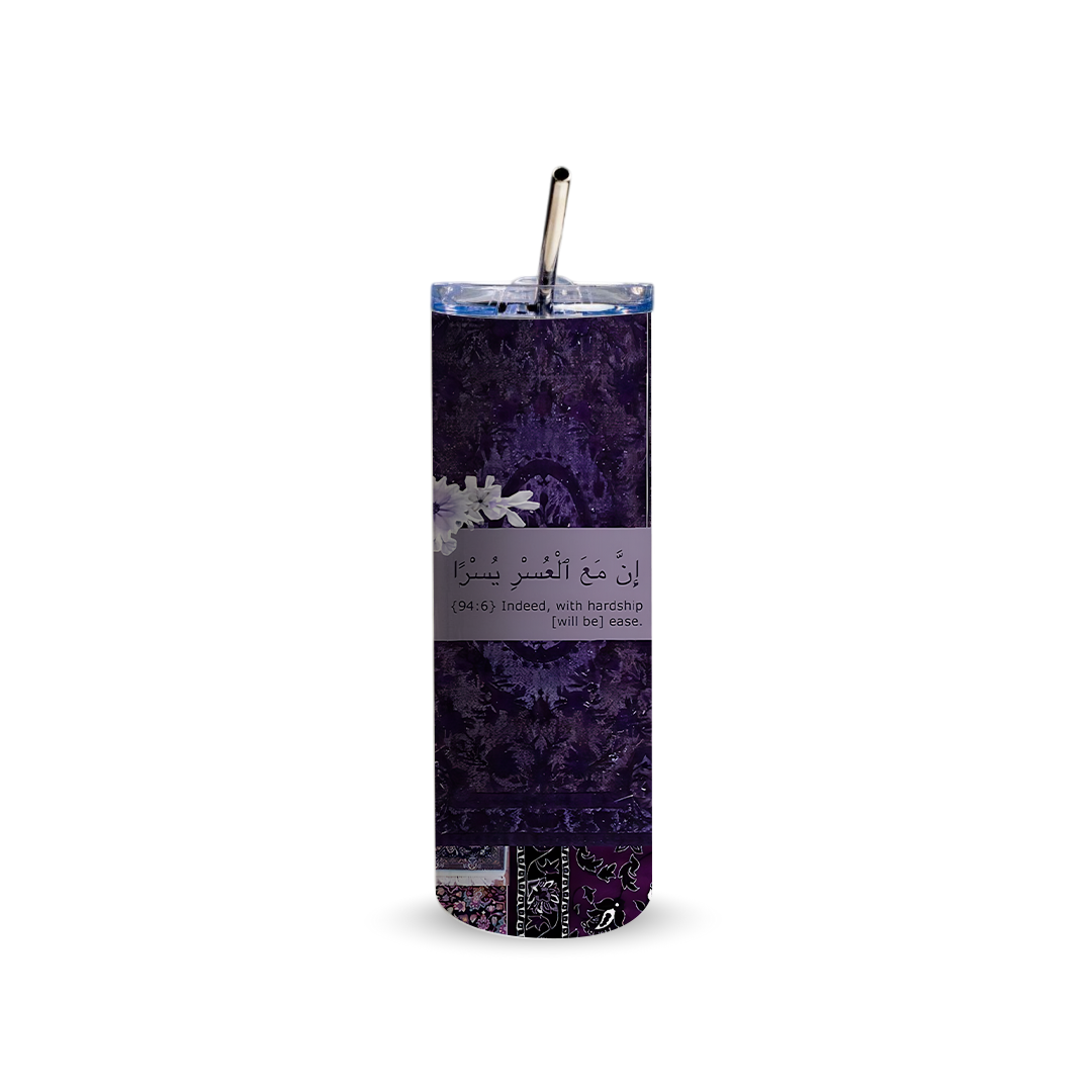 Sip in style with the With Hardship Comes Ease 600ml Tumbler, crafted for convenience durability and everyday hydration. Designed with full wrap printing and a secure lid with reusable stainless steel straw, this premium tumbler keeps your drinks at the perfect temperature throughout the day. Featuring a deep, moody design with rich purple tones, layered textures, and a calming Qur’anic verse-inspired message that reflects patience, hope, and reassurance, it brings a sense of strength and tranquility to every moment, it is perfect for personal use gifting corporate events or branding while adding both personality and performance to every sip.