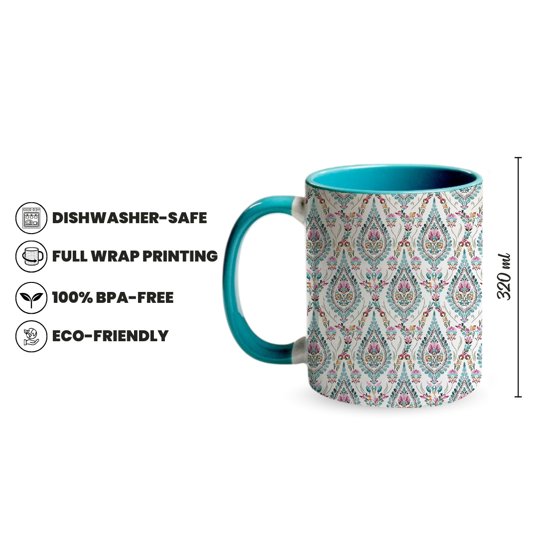 Add a spark to your daily routine with the Arabian Bloom 320ml Ceramic Mug, crafted for comfort, color, and creativity. Designed with full wrap printing and exclusive color options, this high quality ceramic mug delivers vibrant style with lasting durability. Featuring an elegant repeating floral teardrop pattern in soft pastels, beautifully paired with a calming teal interior and handle, it is perfect for everyday use, personalized gifting, corporate branding, or special occasions. It brings freshness, harmony, and refined charm to every sip.