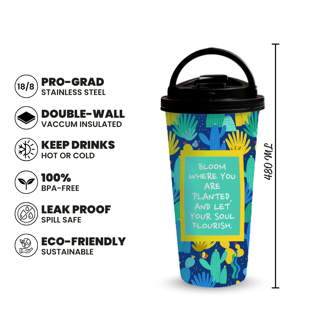 Sip in style with the Cactus Flourish 480ml Tumbler with Handle Lid, crafted for convenience durability and everyday hydration. Designed with full wrap printing and a secure handle lid, this premium tumbler keeps your drinks at the perfect temperature throughout the day. Featuring a cheerful cactus inspired pattern with uplifting colors and motivational details, it is perfect for personal use gifting corporate events or branding while adding both personality and performance to every sip.