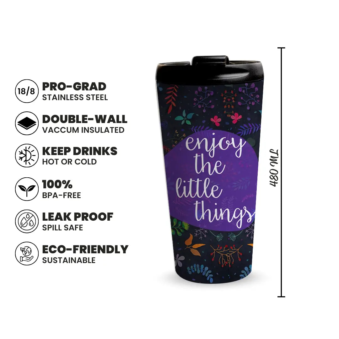 Sip in style with the Dark Flourish 480ml Tumbler, crafted for convenience durability and everyday hydration. Designed with full wrap printing and a secure leak proof lid, this premium tumbler keeps your drinks at the perfect temperature throughout the day. Featuring a rich dark botanical pattern with bright colorful florals and the quote enjoy the little things, it is perfect for personal use gifting corporate events or branding while adding both personality and performance to every sip.