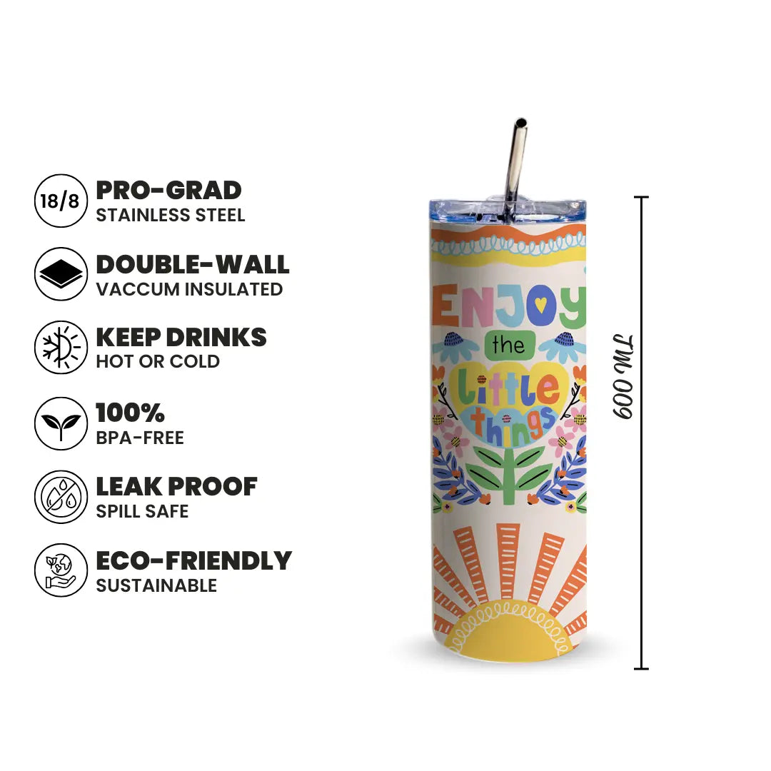 Sip in style with the Little Joy Sunrise 600ml Tumbler, crafted for convenience durability and everyday hydration. Designed with full wrap printing and a secure lid with reusable stainless steel straw, this premium tumbler keeps your drinks at the perfect temperature throughout the day. Featuring a cheerful sunrise inspired design with warm tones playful florals and uplifting typography, it is perfect for personal use gifting corporate events or branding while adding both personality and performance to every sip.