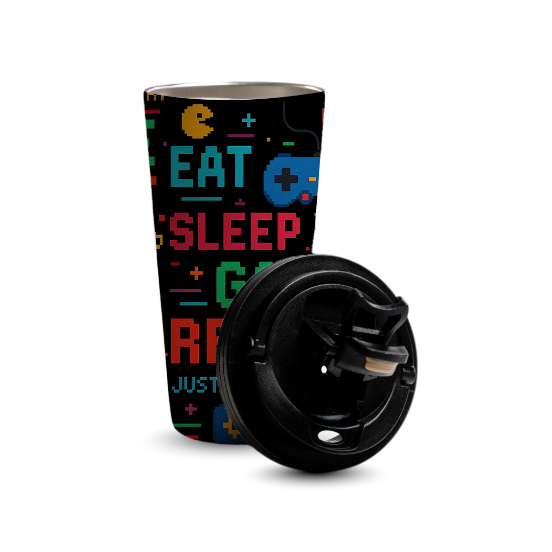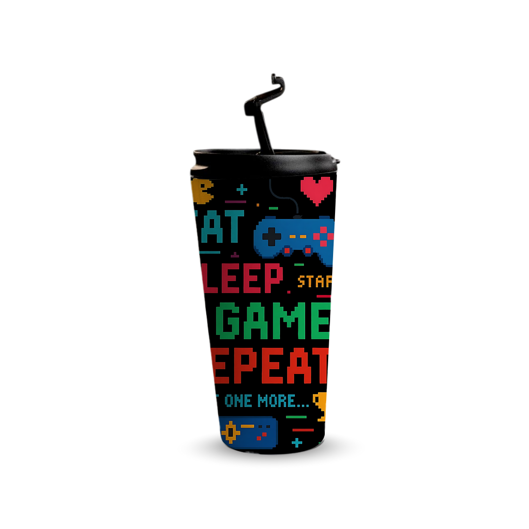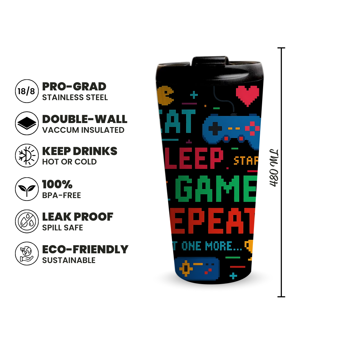 Sip in style with the Pixel Play 480ml Tumbler, crafted for convenience durability and everyday hydration. Designed with full wrap printing and a secure leak proof lid, this premium tumbler keeps your drinks at the perfect temperature throughout the day. Featuring a bold retro gaming pixel art design with controllers arcade icons and vibrant neon colors, it is perfect for gamers personal use gifting corporate events or branding while adding both personality and performance to every sip.