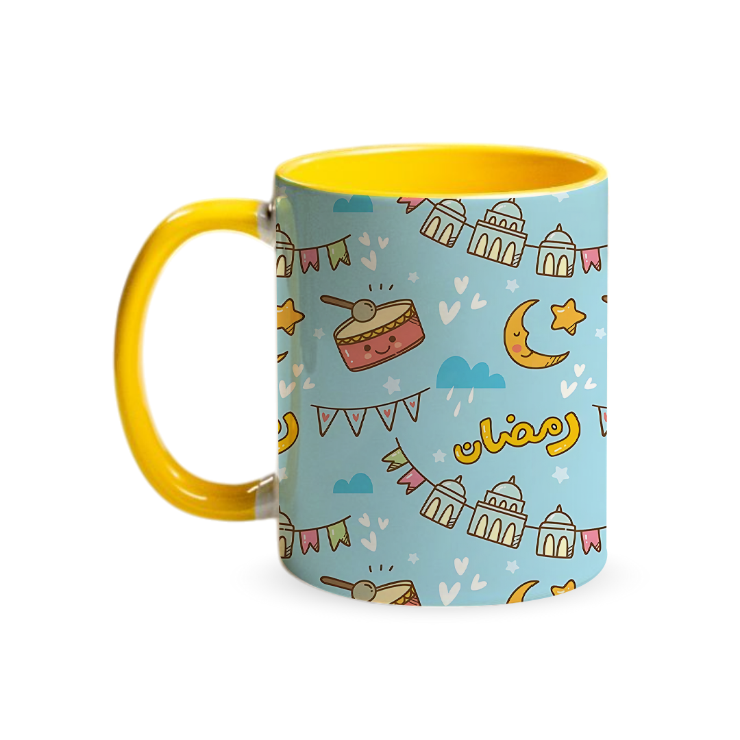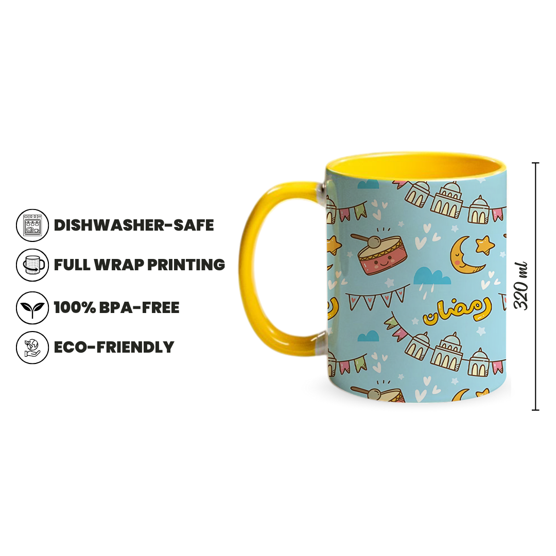 Add a spark to your daily routine with the Ramadan Joy 320ml Ceramic Mug, crafted for comfort, color, and creativity. Designed with full wrap printing and exclusive color options, this high quality ceramic mug delivers vibrant style with lasting durability. Featuring a cute playful Ramadan pattern with crescent moons, stars, lanterns, drums, festive banners, and cheerful Arabic “رمضان” lettering, it is perfect for everyday use, personalized gifting, corporate branding, or special occasions. It brings happiness, warmth, and childlike charm to every sip.