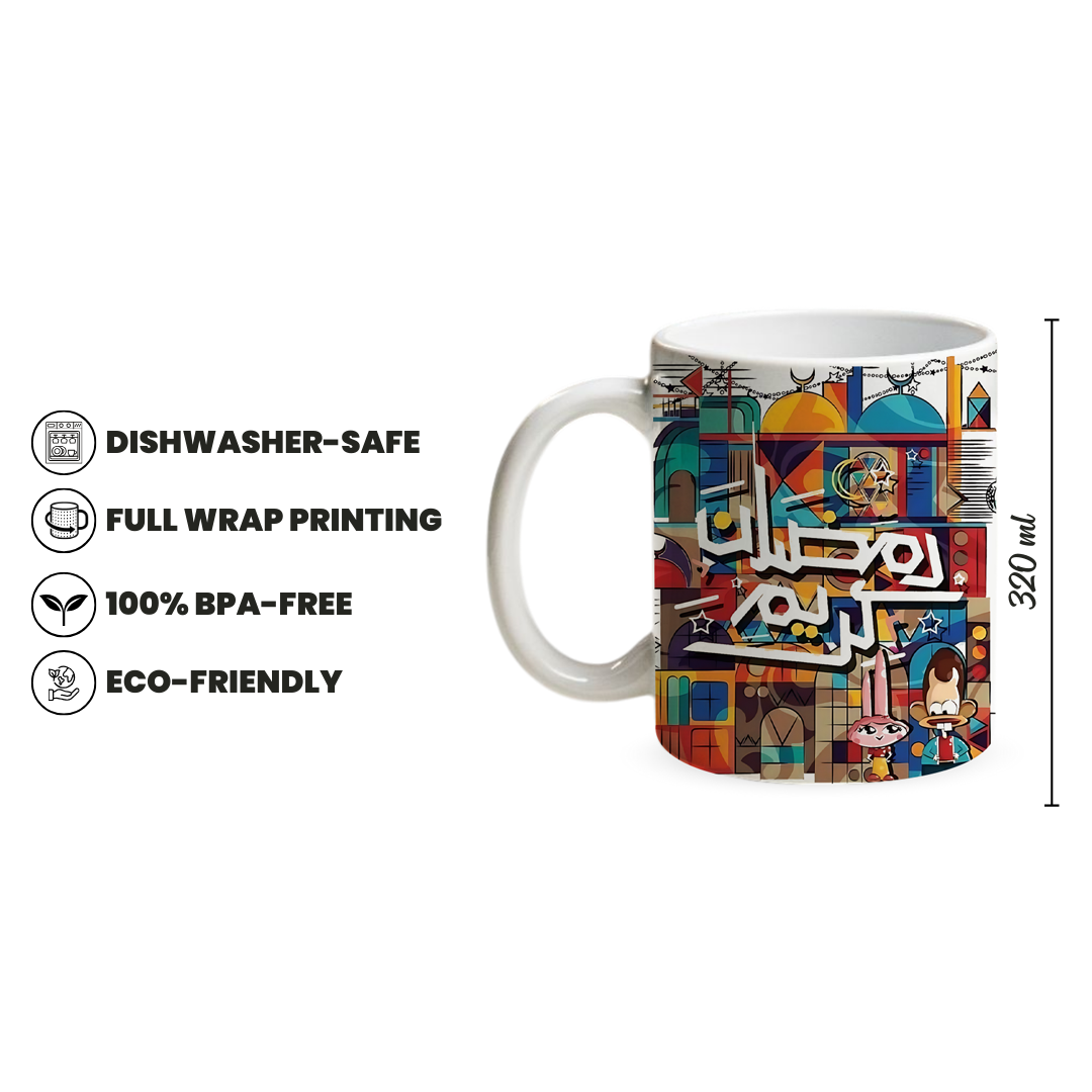 Add a spark to your daily routine with the Ramadan Joy 320ml Ceramic Mug, crafted for comfort, color, and creativity. Designed with full wrap printing and exclusive color options, this high quality ceramic mug delivers vibrant style with lasting durability. Featuring a bold and colorful modern illustration with playful Ramadan characters, geometric shapes, crescent moons, and festive details, this design blends tradition with a contemporary artistic twist. Perfect for daily coffee breaks, Ramadan gatherings, or cheerful gifting, it adds energy, creativity, and festive spirit to every sip.
