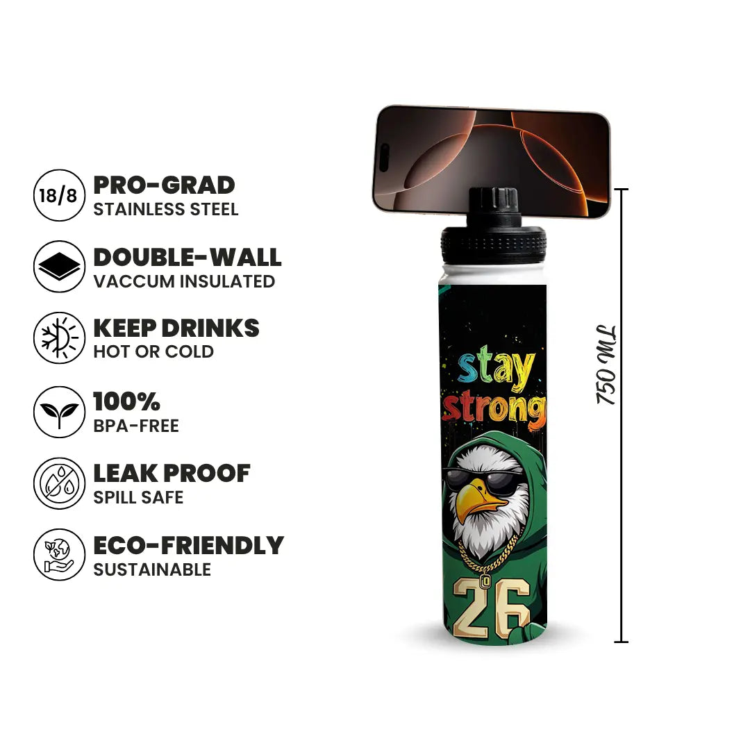 Push harder with theStay Strong Eagle 750ml Bottle, made for those who grind for every goal. Crafted from premium 304 grade stainless steel, it features a MagSafe Lid for effortless hands free use, perfect for gym sessions, training, or content creation.The bold powerful eagle design with strong street style details adds confidence, intensity, and motivation to your daily routine.