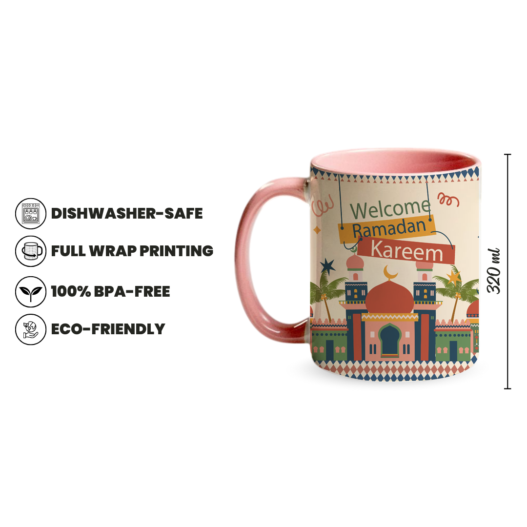 Add a spark to your daily routine with the Welcome Ramadan 320ml Ceramic Mug, crafted for comfort, color, and creativity. Designed with full wrap printing and exclusive color options, this high quality ceramic mug delivers vibrant style with lasting durability. Featuring a cheerful illustrated Ramadan cityscape with domed mosques, palm trees, crescent moon details, and a warm welcoming “Ramadan Kareem” message paired with a soft pink interior and handle, it is perfect for Ramadan mornings, suhoor and iftar moments, personalized gifting, corporate branding, or festive seasonal use. It brings joy, warmth, and celebration to every sip.
